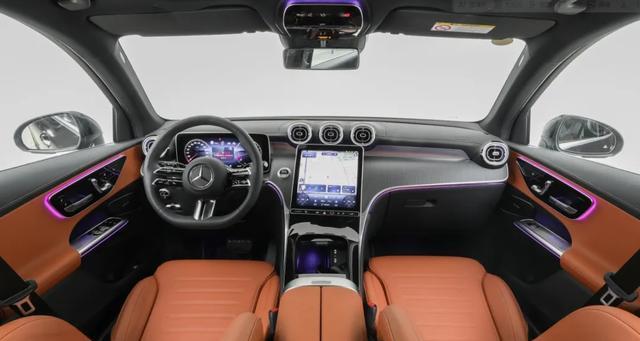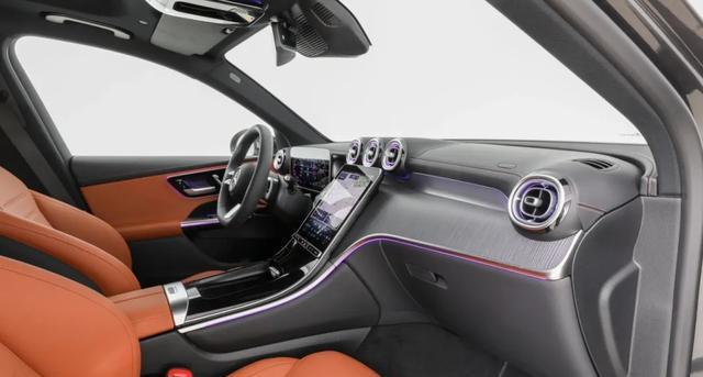 奔驰GLC无论是外观还是内饰设计都非常奢华,它的座舱甚至要比GLS、E级都要漂亮,环抱式的座舱中大量优雅的线条走势,配合细腻的皮革、烤漆、金属等材质以及多色内饰氛围灯,豪华感确实强悍,而且最经典的莫过于蜻蜓式多功能方向盘,圆角回形出风口、游艇甲板式中控面板等时尚元素,氛围感确实拉满了。